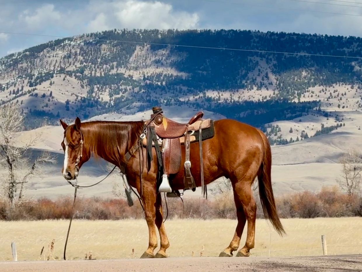 Beretta is a sorrel 9yr old grade Quarter horse gelding that stands 14.3 hands tall. He is all dark legged and has four black feet. A long pretty mane that hangs down below his neck.This is an outstanding, extra gentle family horse that is broke the best. Has a good fast walk and goes with confidence. He has a great handle and is very easy to operate. Excellent neck, rein and will turn around correct, fast or slow both directions. He has a soft, smooth, rocking chair, lope, and will ease around on a loose rein. Lopes pretty circles and picks his leads up like he should. Easy to side pass on and is great at getting gates. he has done everything a horse can do on the ranch and is outstanding in every area. He is great too sort cattle on and will really watch a cow. Has drug calves to the branding fire, pasture roped, and is a finished team roping horse as well. Has been Hauled mostly as a heel horse, but is a pretty handy breakaway horse as well. Has a big sliding stop and lots of natural rate. He is very quiet and calm in the box and knows his job well. Suitable for most people that know how to ride and rope. This horse is very quiet to trail ride on and does not spook at things along the way. Crosses water and other obstacles easily. He is trained to let you get on your mounting block or climb up on the fence and simply smooch to him and he will side step over and let you get on. This horse will always meet you at the gate and is easy to catch. He wants to be your buddy and be where you are. Has never offered a buck and has no silly business in him. He has been ridden by young riders and old. He has been very nice to have in our program and he will be greatly missed. Beretta is guaranteed 100% sound. If you think he might work for you, give us a call and come and try him at the ranch before the sale. (406) 544-9987