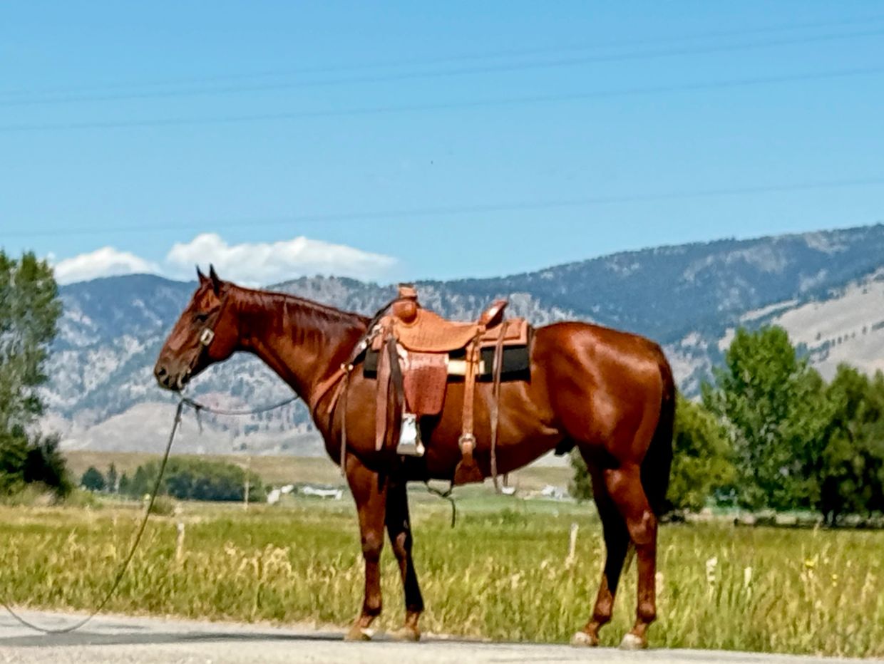 Charmer is an AQHA registered Gelding that stands just under 15.2 hands. This is one for the whole family. Everything about this guy is gentle gentle. He is an experienced ranch horse that has been used for all aspects of ranch work including dragging calves to the branding fire and roping in the pasture. Been used to push and gather cattle in the mountain pastures and is surefooted and will go all day. He is a veteran trail horse as well and has logged many miles prowling the mountain trails and crosses all the different obstacles with ease. He has been ridden by Kids that know how to ride and takes good care of his passengers. He’s the kind you can lay off for months at a time and just go catch him, saddle him up and go, and he will saddle up gentle and ready to go to work every time. He is very easy to catch And stands like a gentleman for the Farrier. Easy to haul and bathe. You can lead him up to any mounting block or step and simply Smooch to him and he will sidestep over and let you get on. This is a very kind hearted guy that has done a little bit of everything. He has also been used as a team roping horse heading and heeling steers in the arena. Stands quiet in the box and scores well. He is very fast and will gather one up quickly. This is a really nice horse that anyone that knows how to ride will get along with. We have used him as a lesson horse for novice riders and have used him on trail rides putting our less experienced riders on him. He has a good one hand neck rein on him and will side pass to open and close gates. He is 100% sound and has no lumps or bumps or blemishes. He is a good looking well bred guy in the prime of his life. He has a good fast walk outside and is smooth to ride. Has never bucked or pulled back. He is the kind you can go get a hard job done and then throw your grandbabies up in the saddle with you and he will just ease around. Feel free to give us a call and come and try him at the ranch. Call or text Tom for more info. 406-544-9987