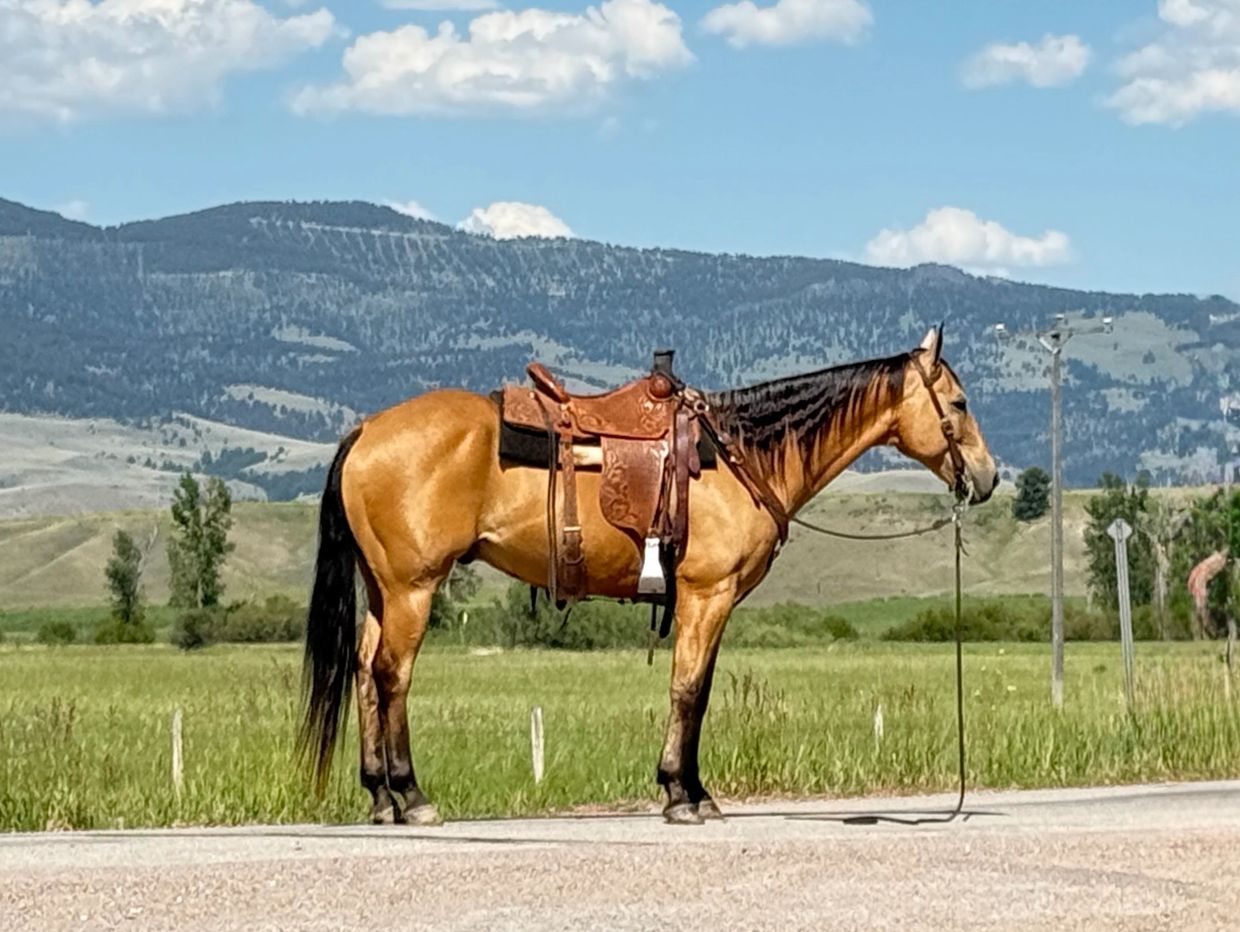 Deuce is a beautiful grade 12 yr old Buckskin gelding that stands 15.2 hands. This such a nice all around ranch and trail horse that is very accomplished. He is a very good cow horse and has done it all. He is great to ranch rope on and has had some roped in the area as well. Great to sort on and will really watch a cow. He has a lot of natural rate and always knows how to be in the right place. He has drug hundreds of calves to the branding fire and is always calm and cool. Has logged many miles out on the trails all over the Rocky Mountains. He crosses water and bridges and is a pleasure to ride and be around. He is not spooky and has been ridden by young riders and old. He has a good one hand neck rein and knows all his maneuvers. Slow smooth lope and will easily step to his leads both directions. He is trained to let you get on from a fence or stump or mounting block. Simply smooch to him and he will swing over and let you on and will not move till you pick up those reins and send him. He is a perfect gentleman to be around in every way and is easy to catch. Good to shoe, bathe and haul. You can wrap a bridle rein one wrap around a rail and he will quietly stand for hours till you return. Not at all buddy or barn sour and will easily ride out by himself. This is one of our favorite family horses that unfortunately is getting to that age where we have to help him find his new home and ride the younger ones. He will be greatly missed. He is truly loved around here. If you think Deuce might be the one you’ve been looking for give us a call and come try him at the Ranch. For price and more info call or text Tom.