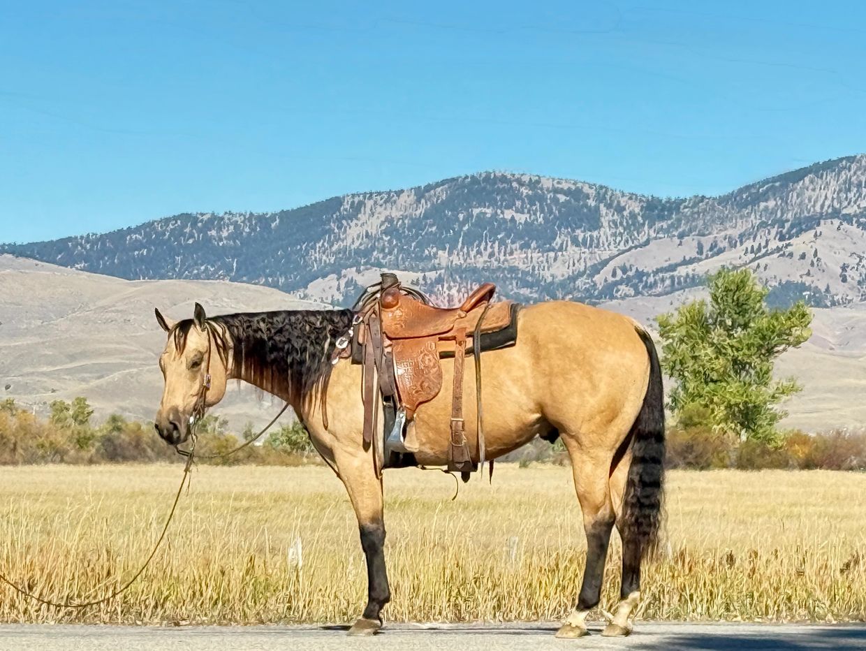 Doubletime Fatty, is a 2022 AQHA Buckskin Gelding that stands 15.1 hands tall. He is stout made and has excellent confirmation. He is Pitzer Ranch bred top and bottom. This guy is extremely gentle and is one the whole family can enjoy. He is fancy broke to ride and has accomplished much for his young age. He is a good ranch and trail gelding that has been used for all aspects of ranch work. He has roped and doctored cattle in the pasture and been used to sort and move cattle around the ranch. Walks out good. He has an excellent one hand neck rein and has all the proper buttons on him. He will spin both directions correctly and step to his correct leads.He lopes nice soft circles in the arena and has a good stop. Good side pass to open and close gates. He is also well started in the arena heading steers and is coming along great. He is very quiet in the box and will run to his spot and rate like one is supposed to. He will pull hard from the saddle horn and has a good finish. He is fun to take to the trails and go exploring on and has logged many miles in the desert and the mountains. He is trained to side pass up to anything you stand up on and make it easier to climb aboard, like a mounting block or off of a fence. Simply Smooch to him and he will side step over and let you get on. This horse has been in good hands his whole life and Is kind and gentle in every way. Has never offered to buck or pull back. Loads,hauls and bathes with ease. Stands like a champ for the Farrier. He has a long thick mane and tail and gets attention everywhere we go. He is royally bred and it shows in how he operates. We have enjoyed having him in our program and know that whoever ends up with him will love him too. He is an outstanding good gelding at the start of his career with all of the hard work done. He is ready to just go use and enjoy at this point. He sells 100% sound in every way and has no blemishes on him. If you think he might be a good fit for you, please give us a call and come and try him at the ranch. For price and more info call or text Tom at 406-544-9987