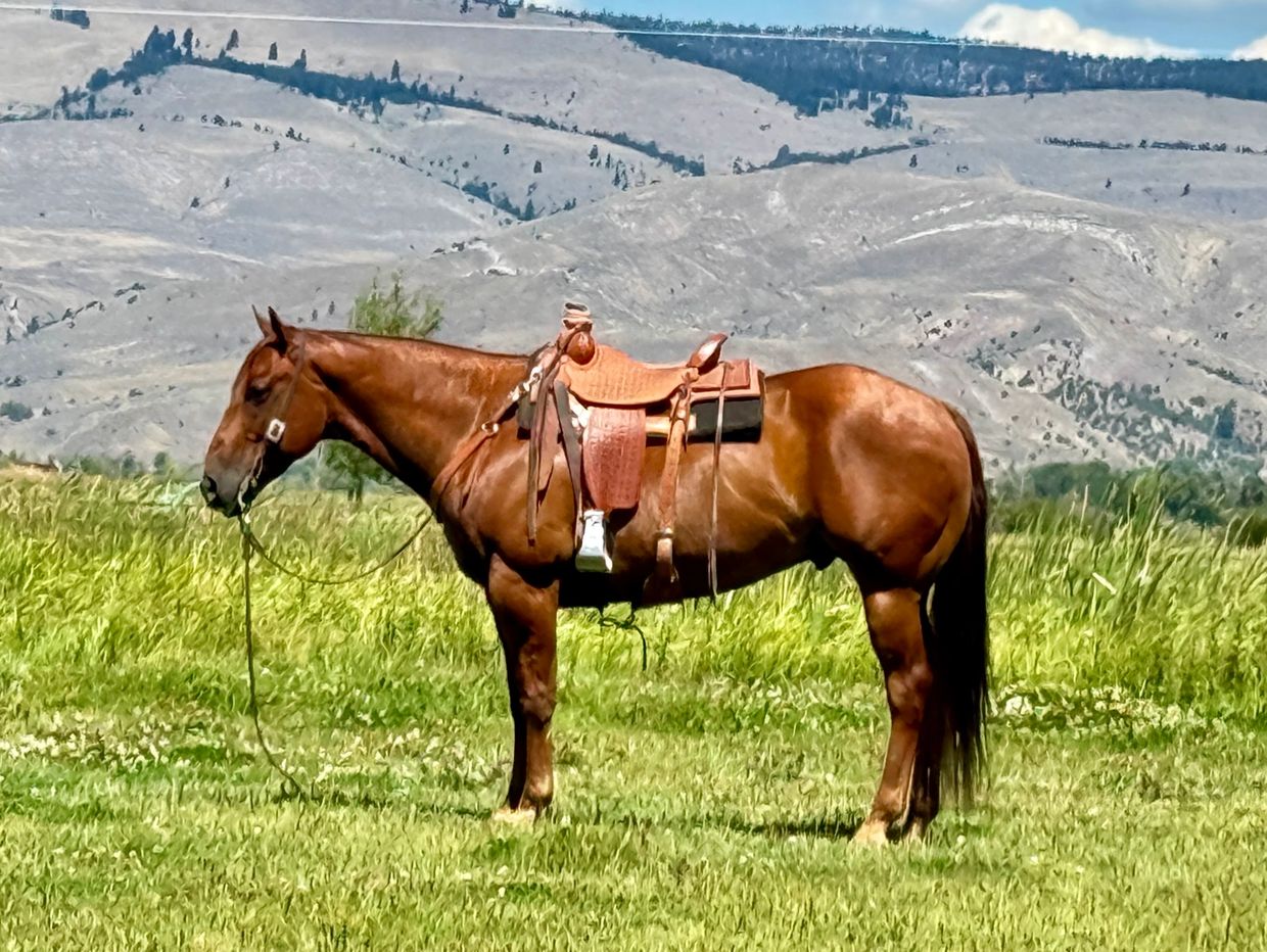 Dually is an AQHA registered 9 yr old sorrel gelding that stands 15.3 hands. This is good looking guy that is one of a kind. Has a great mix of world champions stacked deep on his papers. Like First Down Dash, Dash Ta Fame ,Doc Olena and Dual Pep. He has the perfect mix of foundation cow horses that are bred to run. This guy is extra gentle and very fun to ride. I look forward to riding him because I know I will be well mounted. He is great to go do all of the jobs on the ranch including pushing and sorting cattle and is very good to rope on. He has doctored cattle out in the pasture as well as roping in the arena. He will lock onto a cow and has a ton of natural rate. He is strong and stout and will pull anything you want to tie onto. Including your pick up if it needs a pull start on a cold morning. You can lead this guy up to any step or stump or the back of your horse trailer and simply smooch to him and he will side step over and make it easier to get on. He is fancy broke, especially for a big horse and easily steps to a soft, slow lope both directions. He turns around correct both ways and has a big stop when you say whoa. Easy to side pass to open and close gates from. He crosses water and obstacles and has had lots of trail miles pushing cows around the mountains and pleasure riding. He is friendly and gentle to be around on the ground and one that is not spooky or Watchy. He is used to cow dogs at his heels and the regular commotion of Ranch life. Has drug lots of calves to the branding fire and has been in a couple of Ranch Rodeos as well. this guy is great to shoe and has good hard black feet all the way around. He loads in the trailer and backs out like a gentleman. Loves to get a bath when he is finished working for the day. We have had less experienced riders ride him and they do great. this horse could be finished into a team roping horse with very little effort and could go many different directions. I really like this horse and hope to find him the perfect home. He is 100% sound and gentle and we are proud to offer him for sale at Flint Creek Quarter Horses. If you think he might be a good fit for you, give us a call and come and try him at the ranch. Call or text Tom for price and more info at 406-544-9987