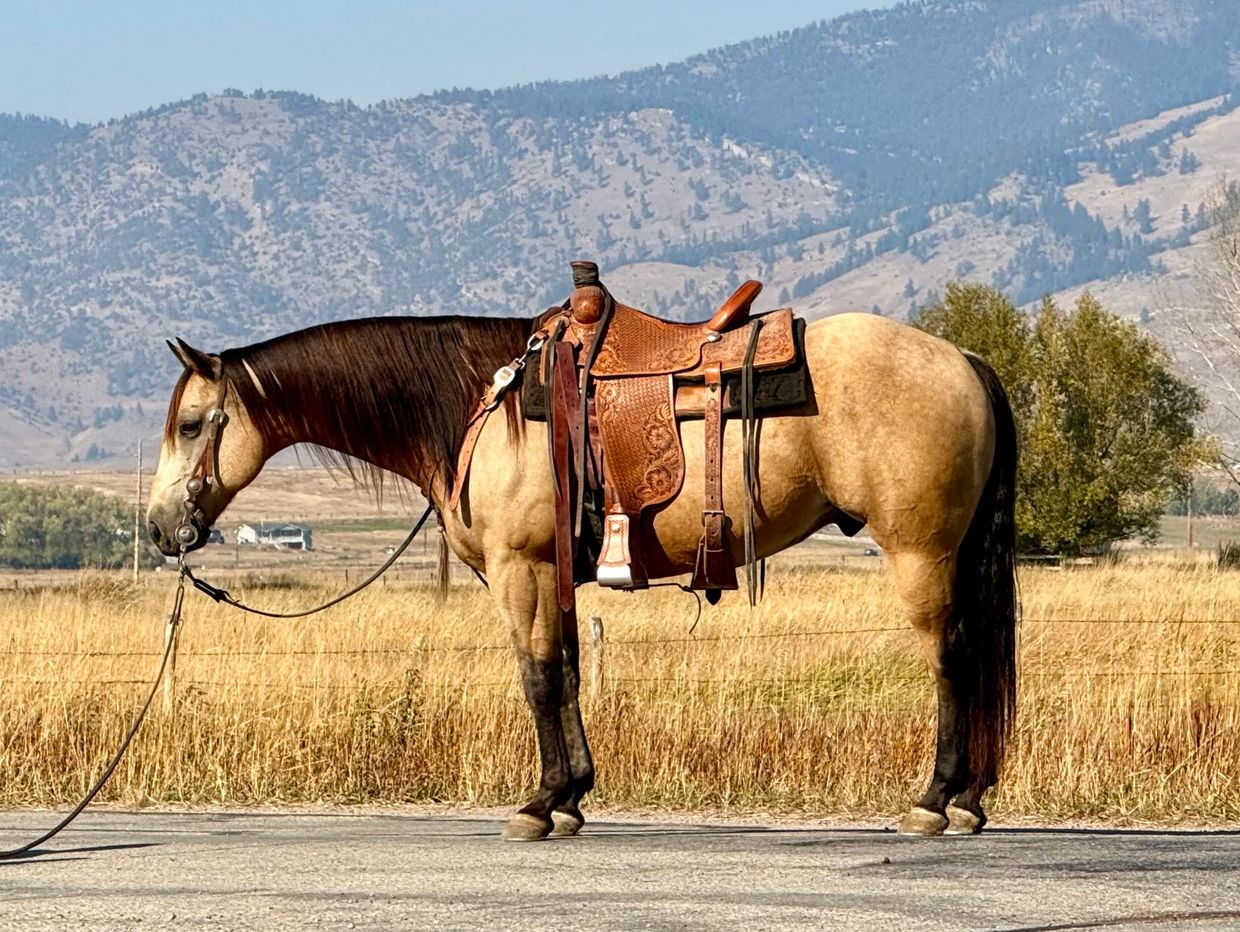 Matador is a pretty buckskin grade quarter horse gelding that stands 14.3 hands tall. He is a stout, made guy with a long man that hangs down below his neck and all black legged. This is a great little all-around horse that you can do lots of different jobs on. He is an excellent trail horse that is not spooky or watchy of things along the way and has a good ground covering walk. has an excellent handle on him and knows all the maneuvers. Good with his leads. Will lope pretty circles and has a big stop. He will turn around correct both directions and is a really fun horse to ride. He is a finished head and heel horse and has also been used as a breakaway horse. He is soft and quiet in the box and scores really well. He is a great little cow horse as well. Excellent to sort off of and will really watch a cow. this horse is a pleasure to ride and be around and has never offered to Buck, pull back or be silly in anyway. Very easy to handle on the ground and loads and halls like a gentleman and will quietly back out of your trailer. This is an outstanding gelding that is safe and 100% sound in every way. If you think Matador might work for you, give us a call and come and try him at the ranch before the sale. For more info call Tom at 406-544-9987