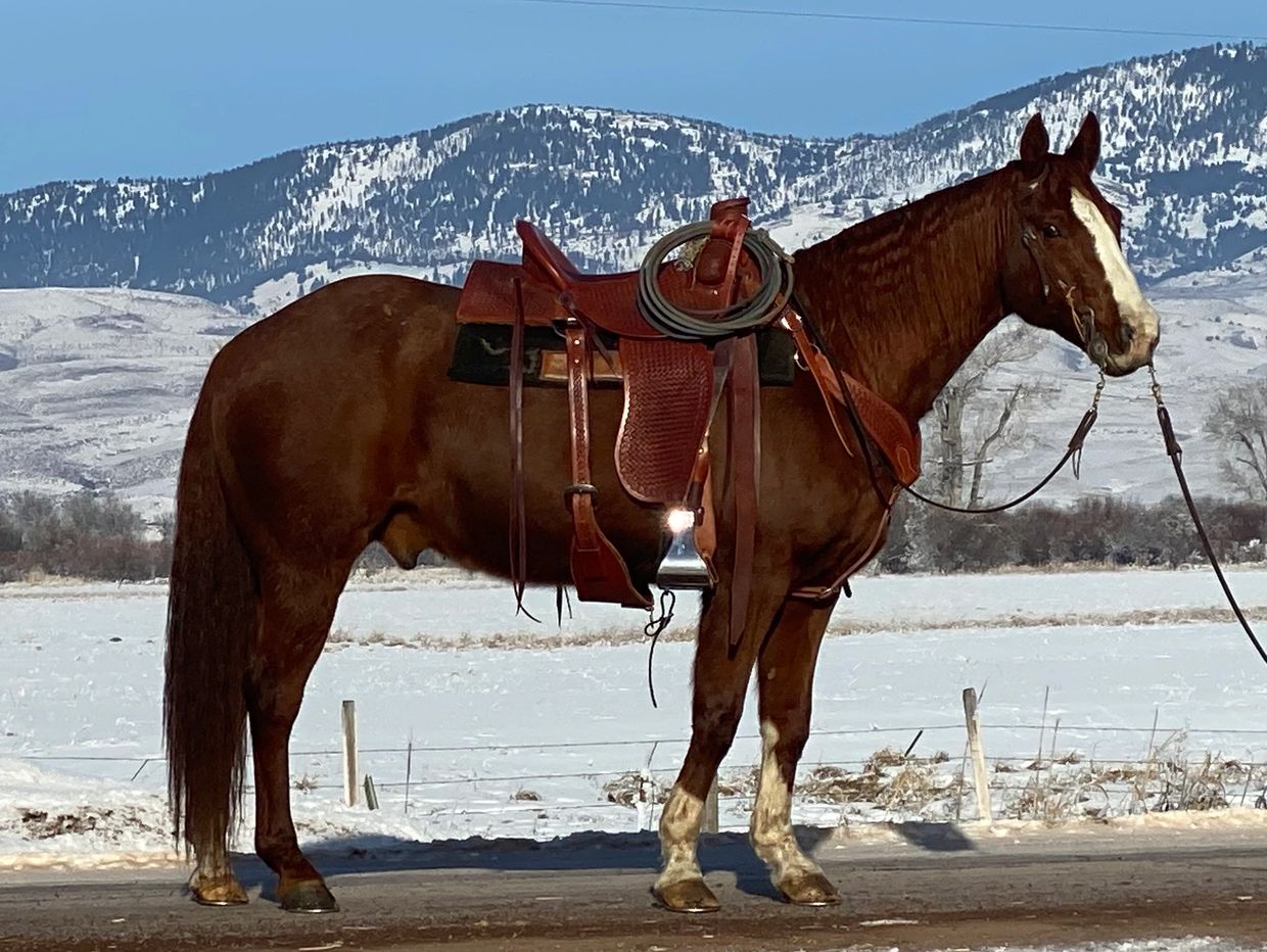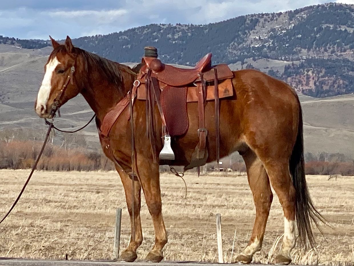 Dollar is a good looking nine-year-old grade sorrel quarter horse that stands 14.3 hands tall. This guy is Montana cool and chromed up to boot. This horse is fancy broke to ride and lopes pretty circles and has a big stop. Dollar has been used mostly as a ranch and trail horse’s and is handy to have around. He is very Cowy and has been used in team penning and sorting events and on the ranch sorting pairs and Roping and doctoring cattle. This horse has been used as a head and heel hose in the arena and is talented on both ends. Low natural headset and quiet disposition and is never humpy or silly. Good to open and close gates off him. He takes his leads both directions and will turn around correct both ways. He’s one that you can pull the bridle off and go show off if you want to or take to the trails for an enjoyable ride. Walks out good and crosses water and obstacles. Good to shoe ,haul and be around on the ground. He is used to border collie dogs at his heels and trucks , kids and four wheelers causing a ruckus. Easy to catch and loves people and attention. Dollar has been one of our favorites and hate to see him go. Hope to find him a great new home. Contact us for more info and come see him at the ranch. Call or text for pricing. 406-544-9987