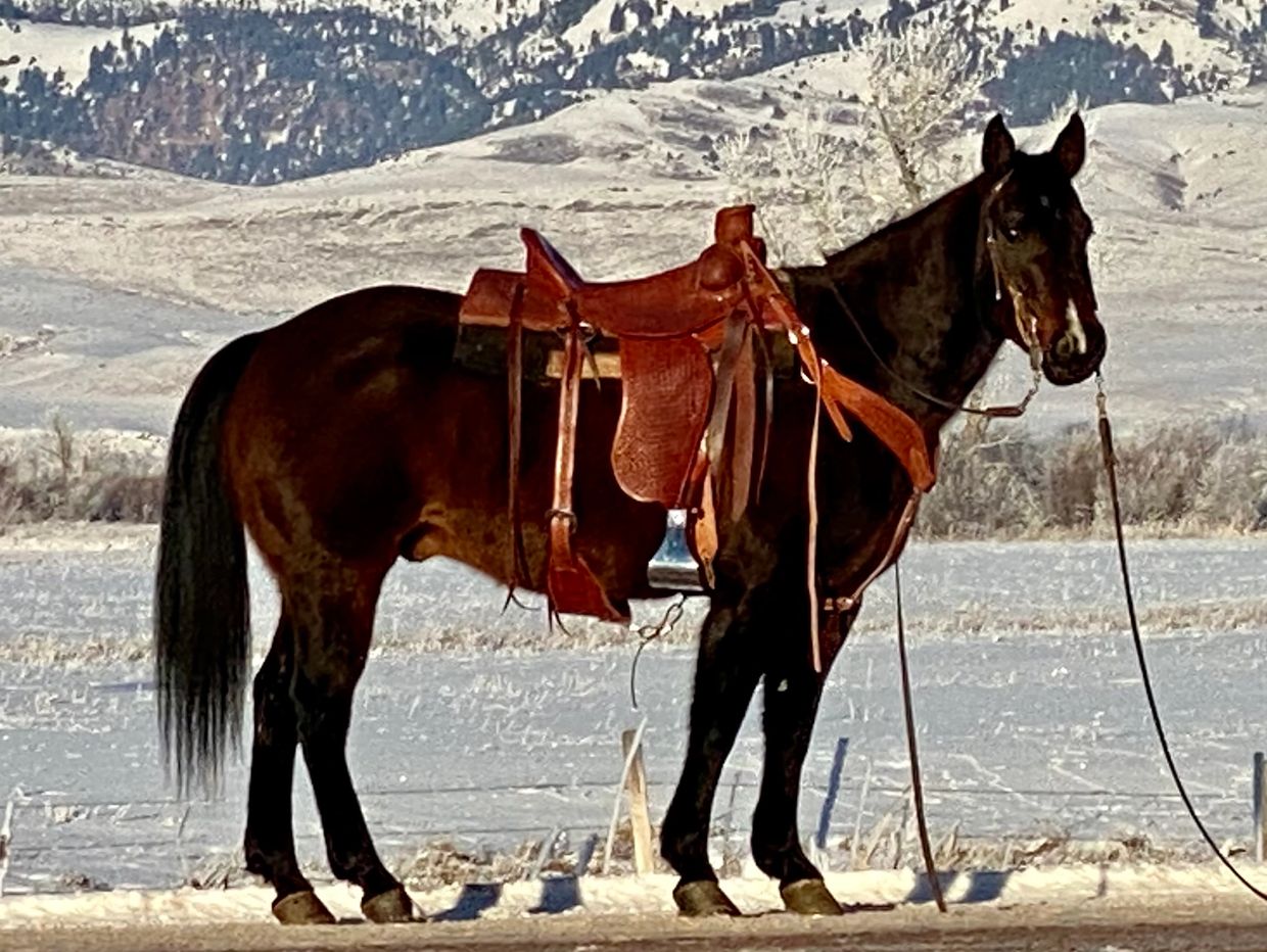 Papa George is a 12 year old registered AQHA seal brown gelding that stands 14.3 hands tall and is stout made. This guy is a ranch horse deluxe. He is very handy broke to ride with a good one hand neck rein and a big sliding stop. This guy has heart. He has been behind lots of cattle throughout his life and is great to sort and work cows on and is very good on the end of the rope. We have roped and doctored on him outside in the pastures and on the ranch and he is outstanding. He is really good in the branding pen and has drug hundreds of calves to the fire. Has been started in Team roping as well and has tons of potential. This guy has a running walk and will really cover the country. Absolutely sound and gentle. Been to hunting camp and has packed out game. You are well mounted when you’re on this guy. He is royally bred and is not good by accident. Come check out Papa George and see if he is the kind you’re looking for. Guaranteed sound and gentle. Call for Price and Info. 406-544-9987