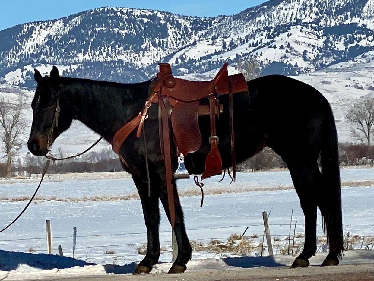 Bourbon, is a pretty black 7 year old AQHA registered gelding that stand’s 15.hands. He has been used mostly as a ranch horse and has been around cattle his whole life. This horse is friendly and gentle and has a nice handle on him. Good one hand neck rein and confidently goes where you point him. Lopes nice circles and has a smooth lope. Easy going,Smooth and comfortable to ride. Has had a lot of time penning back cattle in the feed lot and knows how to watch a cow. This Horse has also been Roped off of outside on the ranch and in the branding pen. This horse is a good all-around using horse. Side passes to open and close gates. Great out on the trails and exploring the back country. This horse also has a ton of potential to be taken on as a performance horse. Could excel in multiple events including team roping and barrel racing. Come check out Bourbon and see if he could work for you. Call or text for price and info. 4065449987