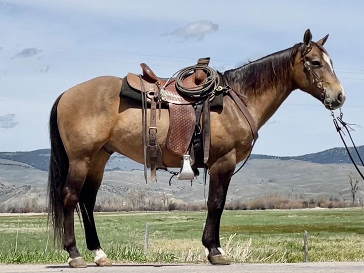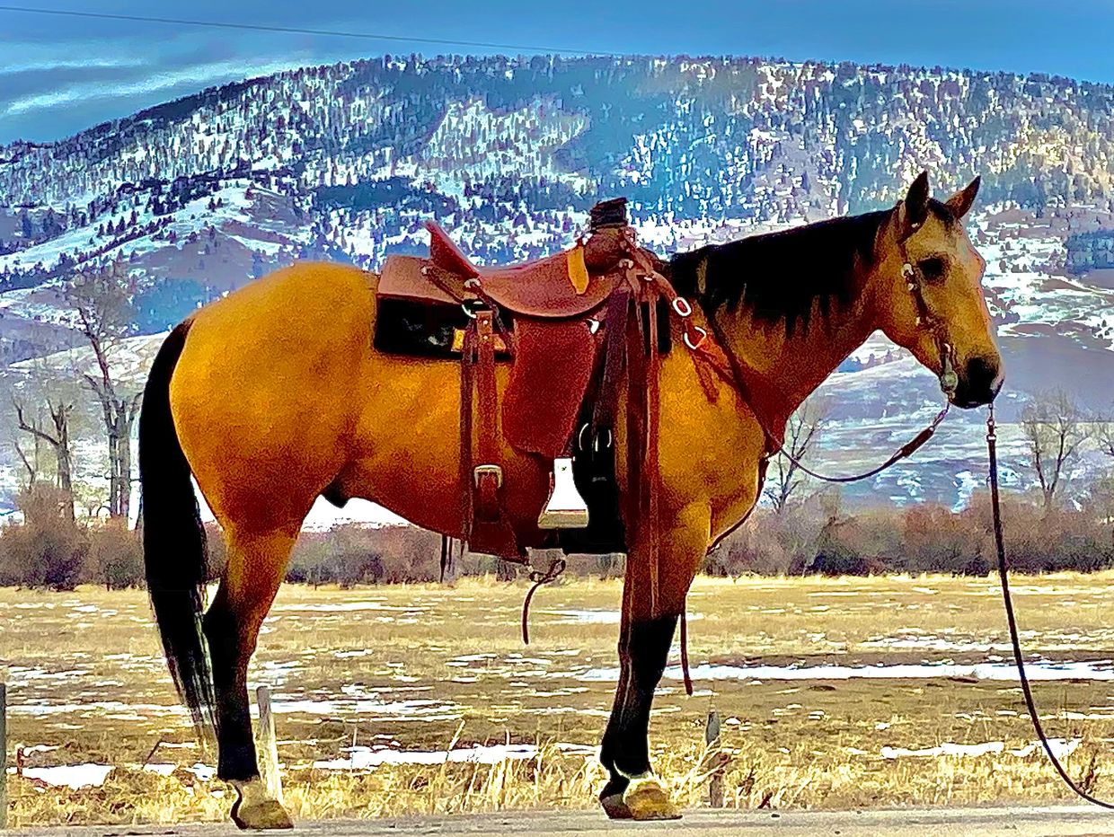 Hollywood is a 10 year old AQHA reg. beautiful buckskin gelding that stands 15.1 hands tall. This guy is an excellent ranch , rope and trail horse. He has a ground covering fast walk and confidently goes where you point him. He has a nice one hand neck rein and will roll over his hocks and pick up his leads both directions. He has been ridden in the mountains and crosses obstacles with ease. Hollywood is very friendly and personable and gentle for most anyone that knows how to ride and is somewhat experienced with Horses. He is great to work and sort cattle on and has been used to Rope and Doctor sick cattle and has had some cattle roped on him in the arena. He is great in the branding pen and has drug many calves to the fire. Great to open and close gates on and has a comfortable walk trot and lope. He is soft in the bridal and will patiently stand tied wherever you leave him without a fuss. He is a total gentleman on the ground and will ground Tie. Very quiet to trailer down the road and has good manners for the Farrier . Has always been extremely sound in every way. If you are looking for a gentle reliable beautiful guy to take home and love give us a call and we would love to tell you about Hollywood. Call or text for pricing and info. 4065449987