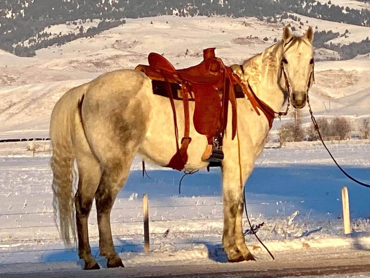 Oxbow is a 10 year old grade gray gelding that stands a big 16 hands. He is big and stout and built like a tank. He is well broke with a good one hand neck rein. He has been used on the ranch for everything imaginable including roping and doctoring outside cattle working in the feedlot and gathering cows in the back country. He walks out good and is good with his leads both directions. Lopes nice circles and is gentle for most people that can sit up and ride. He has also been used some as a head horse turning steers but is not totally finished. Has the potential to finish easy and be a really nice Rope Horse. This is the kind of horse you could not cripple with a double bladed ax. He is double tough and a big friendly gentle giant. Little kids have rode him around and he just melts down to their level. Good to shoe Crosswater and haul in the trailer. This is a horse that has drug hundreds of calves to the branding fire and is a true blue ranch horse.This horse is a fabulous outside trail horse that goes anywhere you point him with no fuss. Give us a call or come check him out at the ranch. 406-544-9987