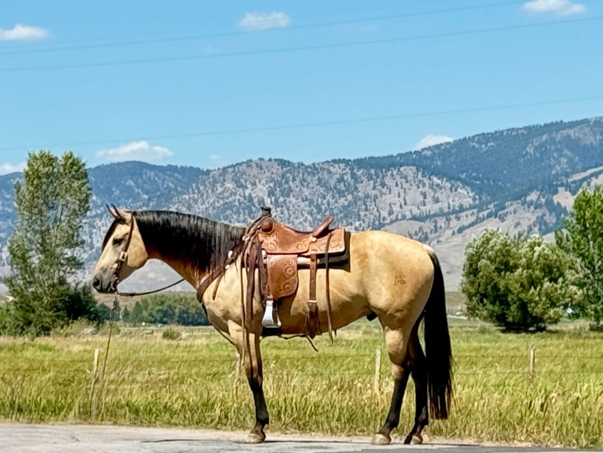 Teton is a big beautiful AQHA buckskin 11-year-old gelding that stands just under 15.3 hands. He sells with all of the necessary paperwork to get him registered, but we have not sent it in. He has lots of legends in his lineage, including Freckles, Playboy, Young Gun, and Docs Oak. And sells that way. This is a big good looking stout made guy that is very well broke in every way. Is an experienced ranch horse and has spent lots of time in the big feed lots in West Texas roping and doctoring cattle in the pens and out in the pastures. He is a finished head and heel horse as well and really knows his job . Lots of run and rate and is good in the box. He has a good one hand Neck Rein on him and Will pick his leads up both directions and has a big dragging stop. This guy is a joy to saddle up and Trail ride on as well and has been all over the country up and down the mountain trails exploring the high mountain lakes and the desert canyons. He crosses all the water obstacles and deadfall with ease. You can lead him up to any step or mounting block and simply Smooch to him and he will sidestep over and let you get on. He will not move until you pick up those reins,lean forward and send him. Teton is very gentle in every way and will meet you at the gate and follow you around like a puppy dog. He stands like a champ for the Farrier and has really nice hard black feet. He has never offered to buck or pull back and is the kind you can lay off for months and just go grab him when you need him and he will be gentle. He is great to use on the ranch and makes it very easy to open and close gates. He is very stout to the horn and will pull anything you can latch onto. he is 100% sound with no lumps or bumps or blemishes. Has a long thick mane with white highlights throughout it and a thick long tail and a forelock that hangs clear down his face. This is a big good looking Buckskin that is a rare find. He has been in good hands his whole life and we are proud to offer him for Sale. Give us a call and come and try him at the ranch. For more info call or text Tom at 406-544-9987